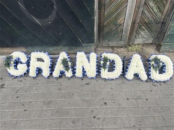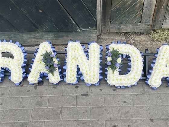 Grandad tribute lettering with blue ribbon white massed letters and purple/blue spray