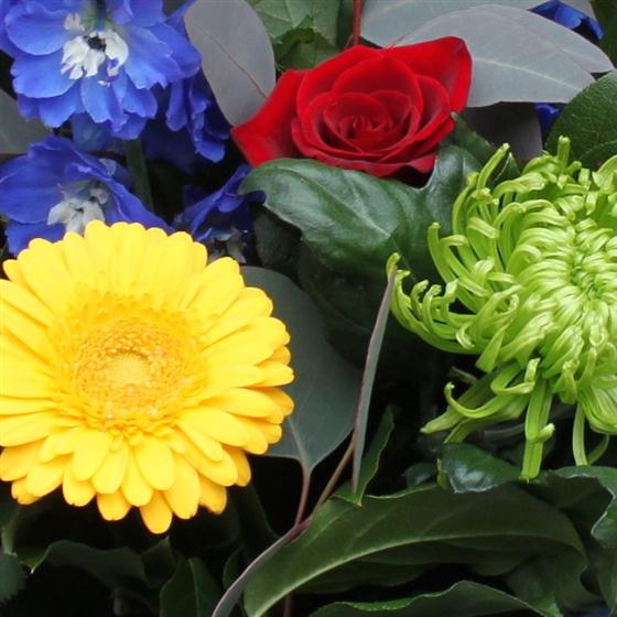 Delphinium in blue with bold and clashy summer flowers to compliment. Aromatic foliages come as standard. Sure to please.