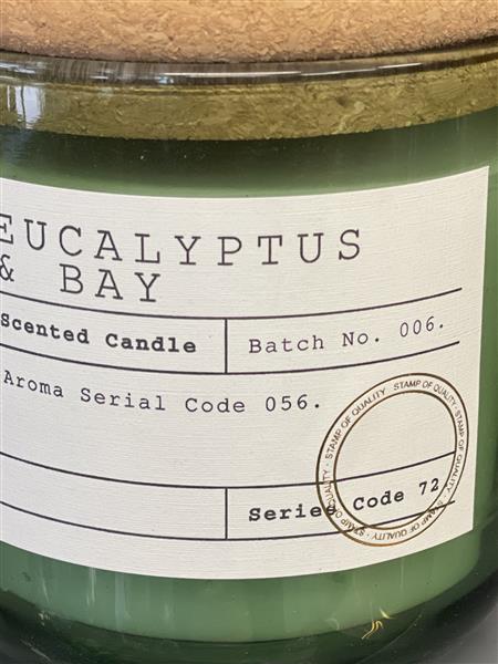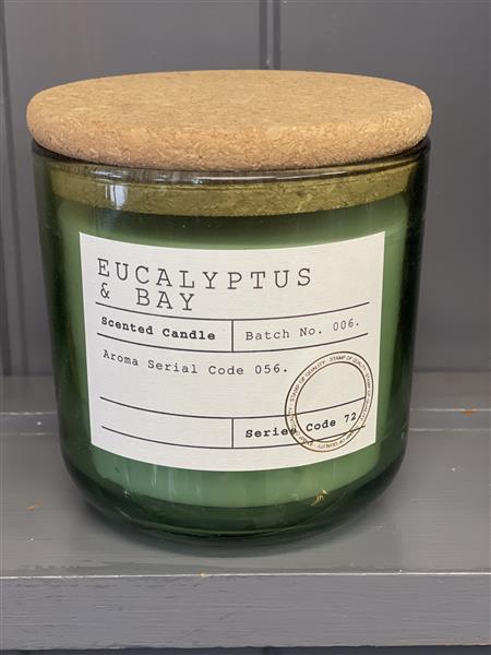 Glass Filled Wax Pot with Cork Lid in Eucalyptus and Bay Scent Mesmerizing eucalyptus and bay melange ,Burn time of 30 hours.