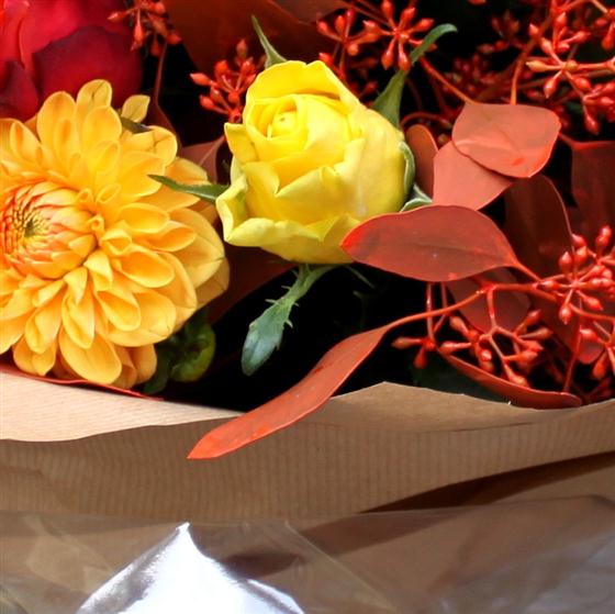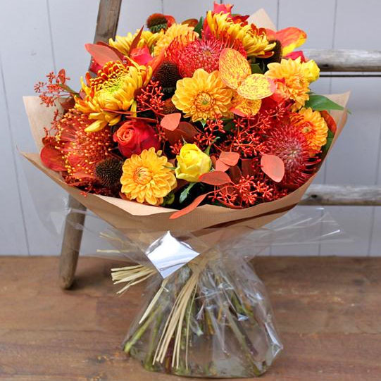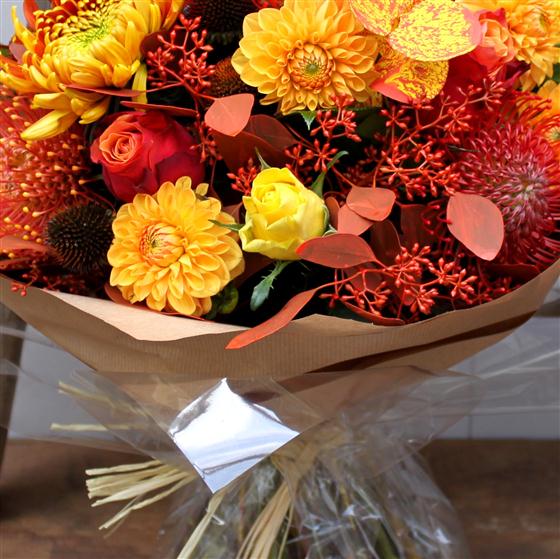 A magnificent display of deep gold, red and orange blooms in an array of textures and shades. This bouquet captures the very essence of autumn.