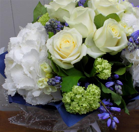 A graceful selection of whites and creams including roses and hydrangeas interspersed with purples and limes.