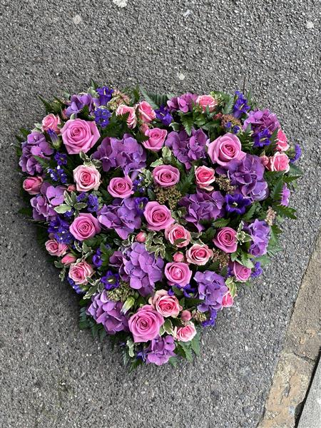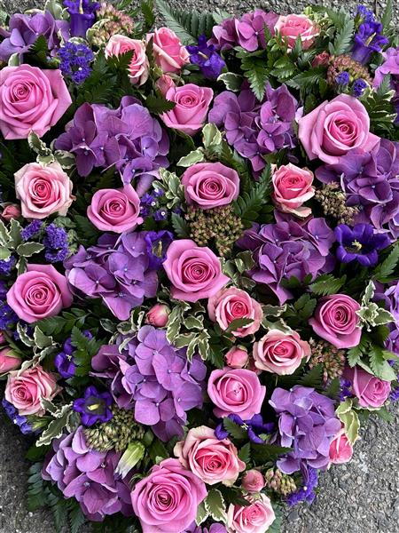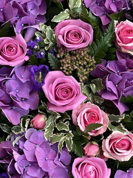 Pink spray rose purple hydrangeas, pink roses and mixture of foliage to complement the flowers
