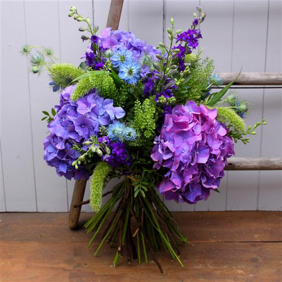 Love in the mist, Thlaspi, Larkspur, Hydrangeas and seasonal foliage combine to make a wonderful hand tie.