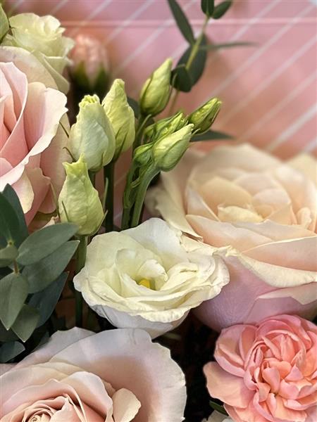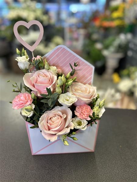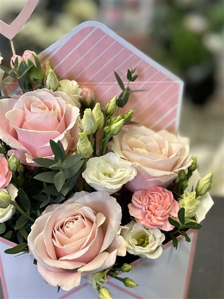 Beautiful envelope, arrangement, flower, consisting of pink roses, white lizzi , pink spray carnation, and mixture of foliages