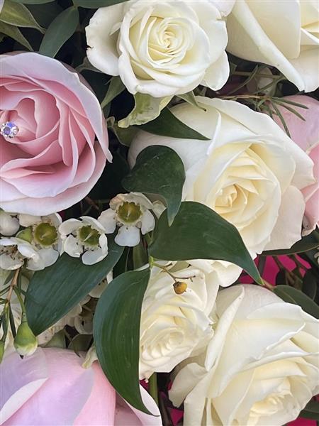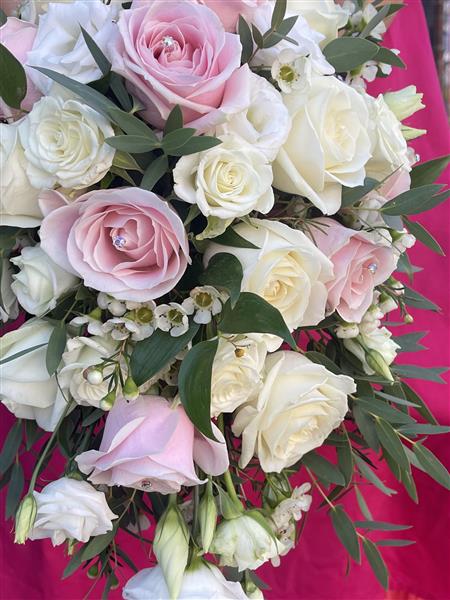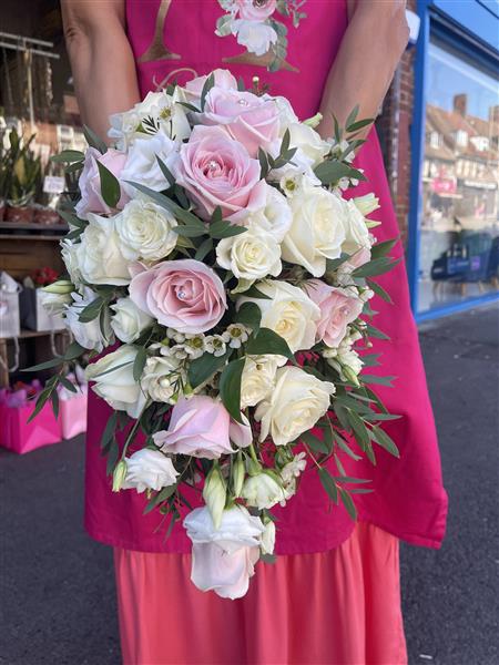 Still beautiful teardrop boutique consisting of pink and white roses. This can be made in any colour choice please call the shop or pop in and see one of our very experience Florist to help design your beautiful Bocquet for your special day
