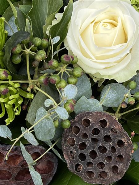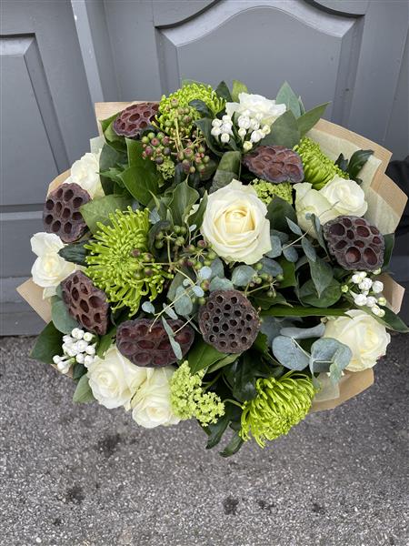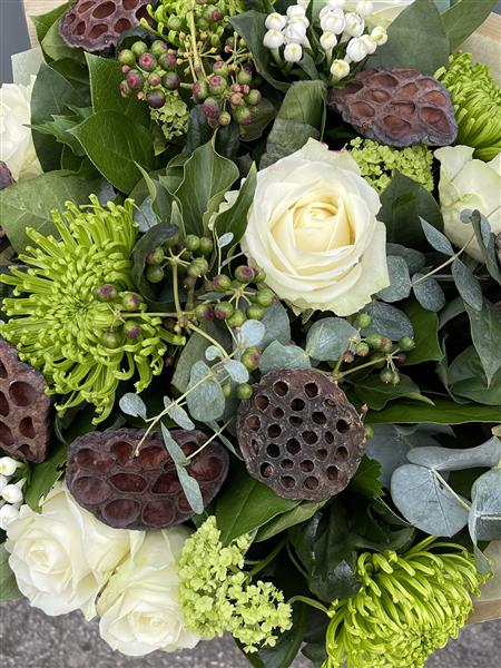 A lovely winter selection of white roses, green blooms, berried ivy and lotus heads